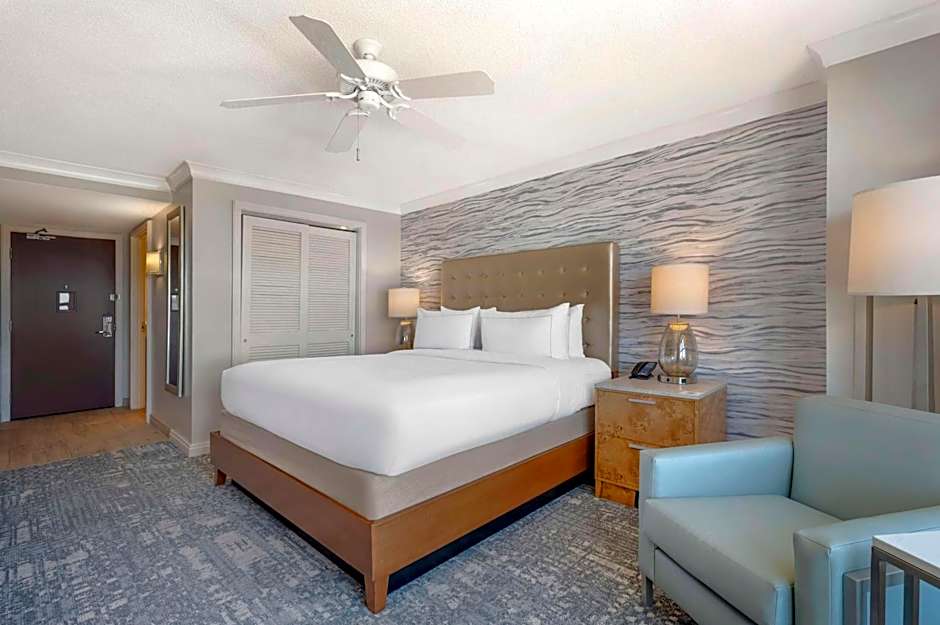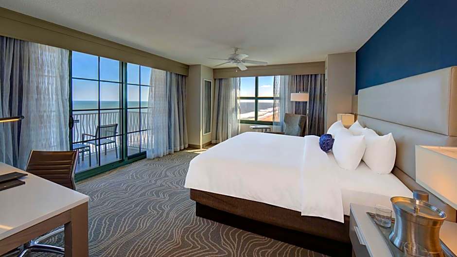 Room has a king-sized bed and offers views of the ocean.